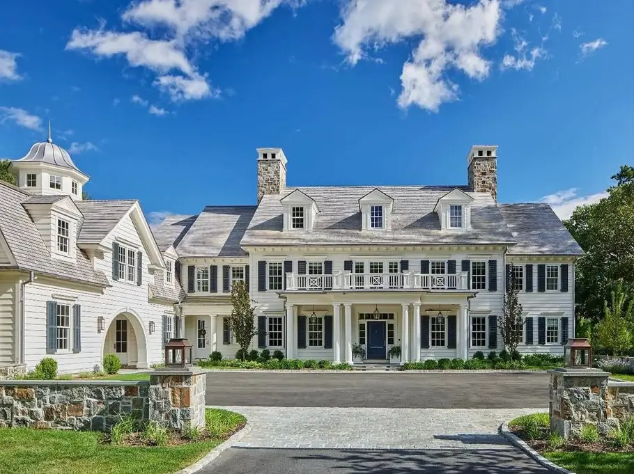 Coastal Colonials often sit on smaller lots and lean vertical to take advantage of the view. Cream clapboard walls and twin chimneys frame an ornate sunburst entry, with a brick driveway curving toward the water. On a shoreline lot, that kind of verticality often makes more sense than sprawling outward.